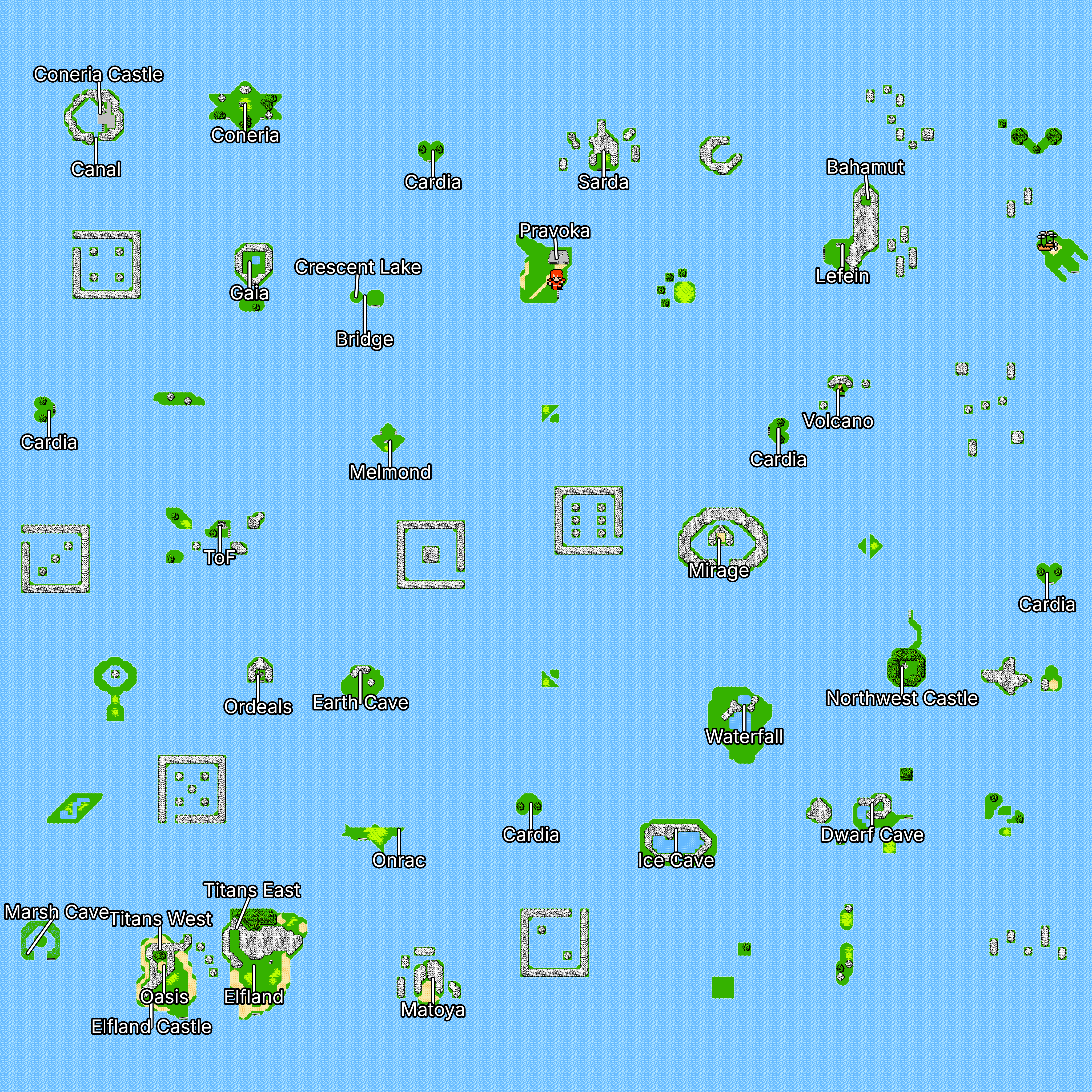 A revamped twist on the classic FF1 map, this version alters much of the terrain, shifting locations around while moving many familiar places to unfamilar areas. It puts a greater emphasis on walking the main continent while also enticing switching up the usual incentive locations.